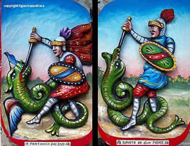 La chiave di carretto ("chiavi d'arreri") - E' la parte di maggiore rilievo, un elemento ornamentale fra i più importanti del carretto. Scolpita generalmente in bassorilievo raffigurante scene cavalleresche, ma anche soggetti religiosi o di vita popolare. Lateralmente è ornata con rosoni, angeli, draghi e teste di paladini.